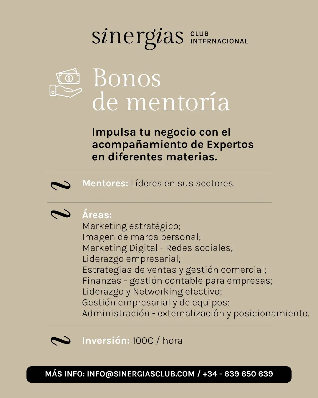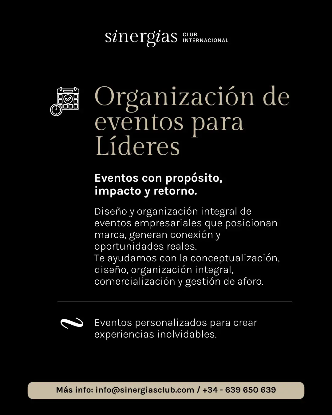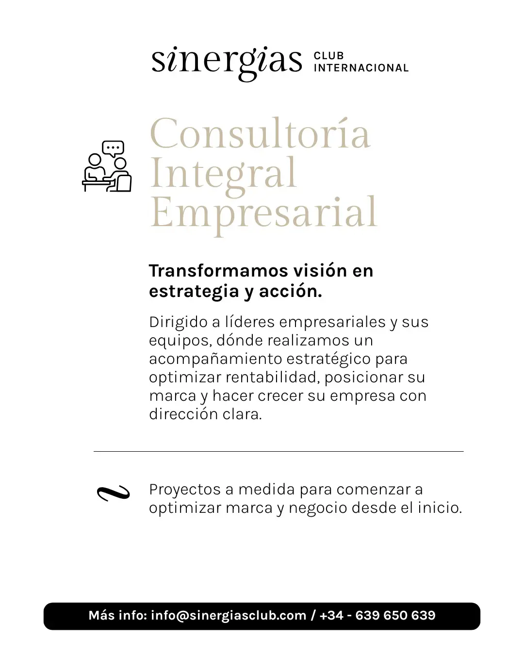 Servicios y Productos En Sinergias Club no estás solo, te acompañamos con estrategia, consultoría y experiencias que generan impacto real. Más información Acompañamos a líderes y empresas que quieren pasar a otro nivel. Escríbenos ¿Cuántas oportunidades llevas perdidas por no haberte asociado?No pospongas tu éxito por más tiempo y asóciate!Haz clic aquí Contacta con nosotros Y empieza a generar negocio asentando tu imagen de marca como siempre soñaste. Envelope Whatsapp Phone-alt Map-marker-alt